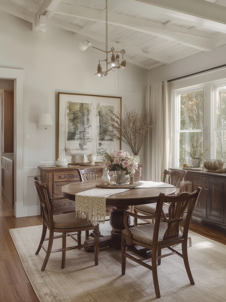 - Vintage charm: Thrifted furniture, heirloom ceramics, and patinaed metal.