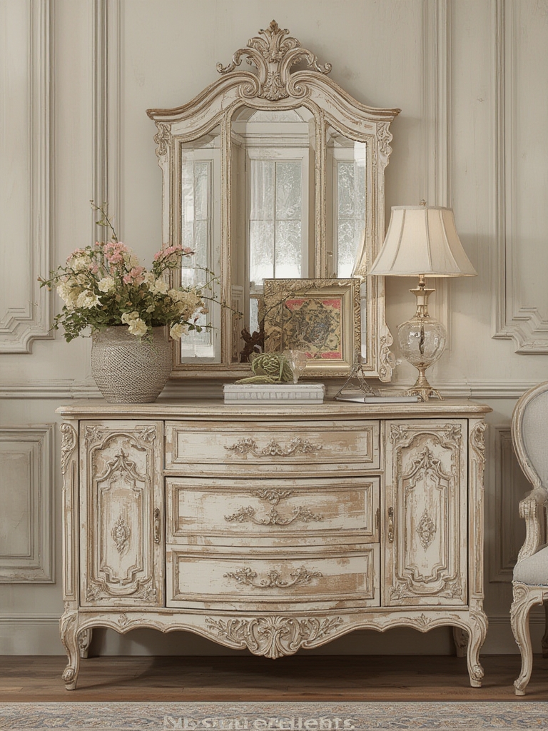 Choose vintage‑style mirrors with ornate frames and pastoral paintings. Position mirrors opposite windows to amplify natural light—a key factor in making distressed finishes appear warm rather than dim.