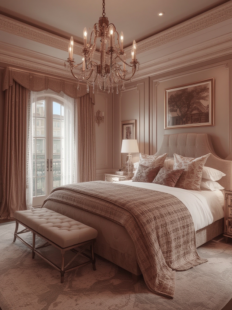 - Accessories: Crystal vases, gold‑finished picture frames, and a vintage perfume bottle on the dresser create layered interest.
