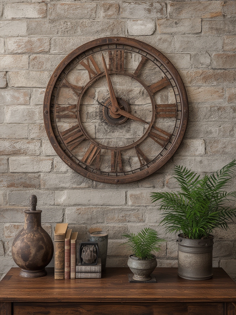 Incorporate metal wall clocks, gear sculptures, or reclaimed signage. Use anchor bolts for heavy pieces—drill a pilot hole, insert a wall plug, then screw in the bolt. This ensures safety and reduces the risk of wall damage.