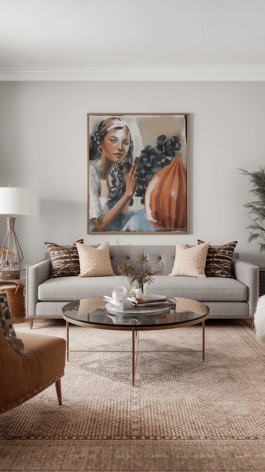 Position the plant on a low console table directly beneath the artwork. This creates a vertical line that draws the eye upward, enhancing the sense of height in the room.