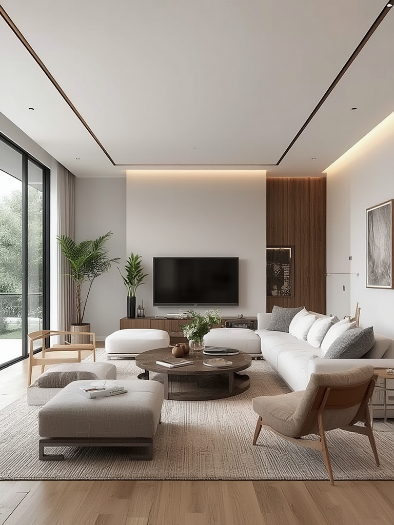 Lay a natural‑fiber rug (jute or sisal) under the coffee table. Add a few cushions in muted tones with subtle texture. Keep decorative objects to a minimum—think a single ceramic vase or a sleek metal sculpture.