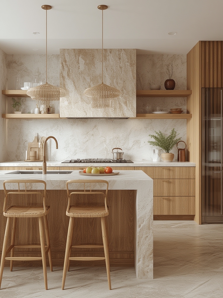 Mix smooth stone surfaces with textured wood grain to add visual interest. For instance, a polished quartz countertop paired with reclaimed barn wood shelving creates a modern‑rustic vibe.