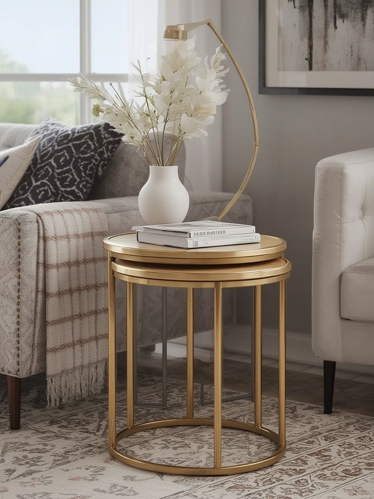 Combine a wooden nesting set with a woven rug and a metal floor lamp. The contrast of textures creates visual interest without overcrowding the space.