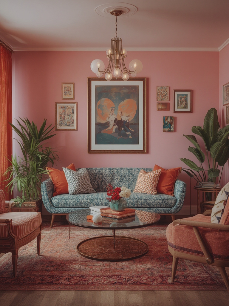 Neon pink, electric blue, and chrome finishes add the signature pop. Pair a neon floor lamp with a brushed‑steel coffee table for a balanced look.