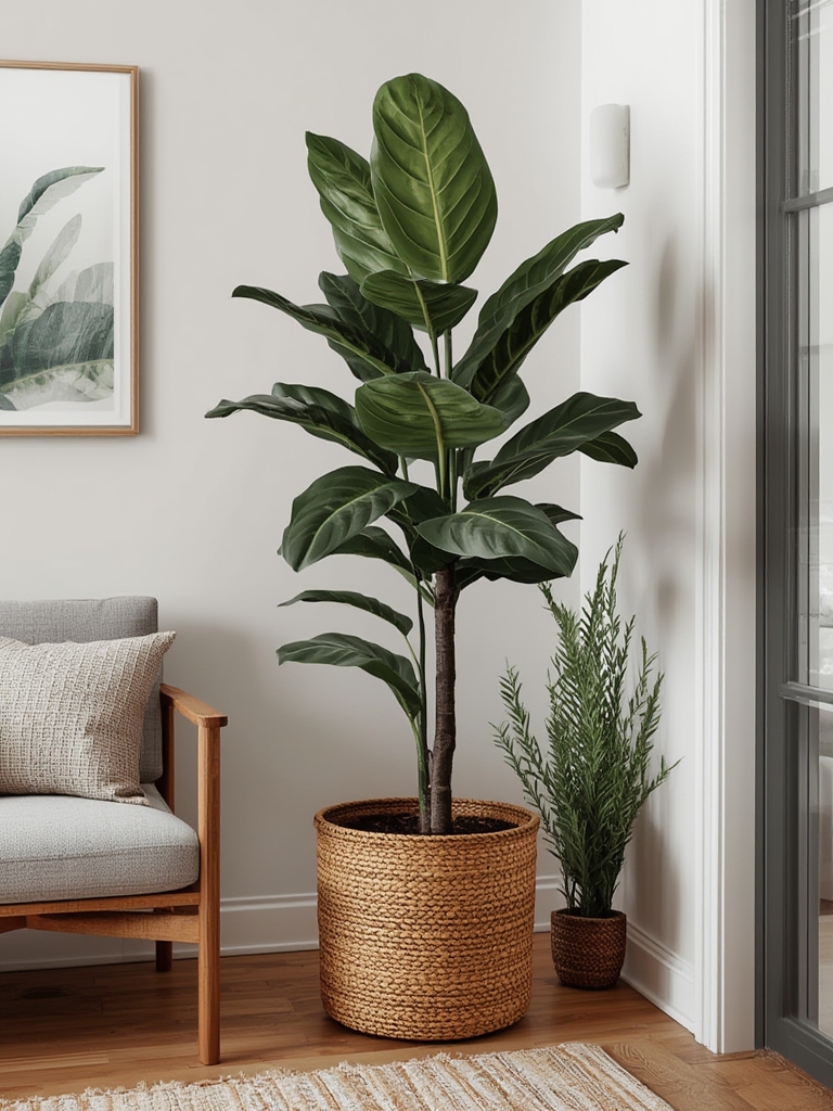 • Texture Contrast: Place a woven jute rug or a reclaimed wood coffee table beneath the pot to highlight the fig’s glossy leaves.